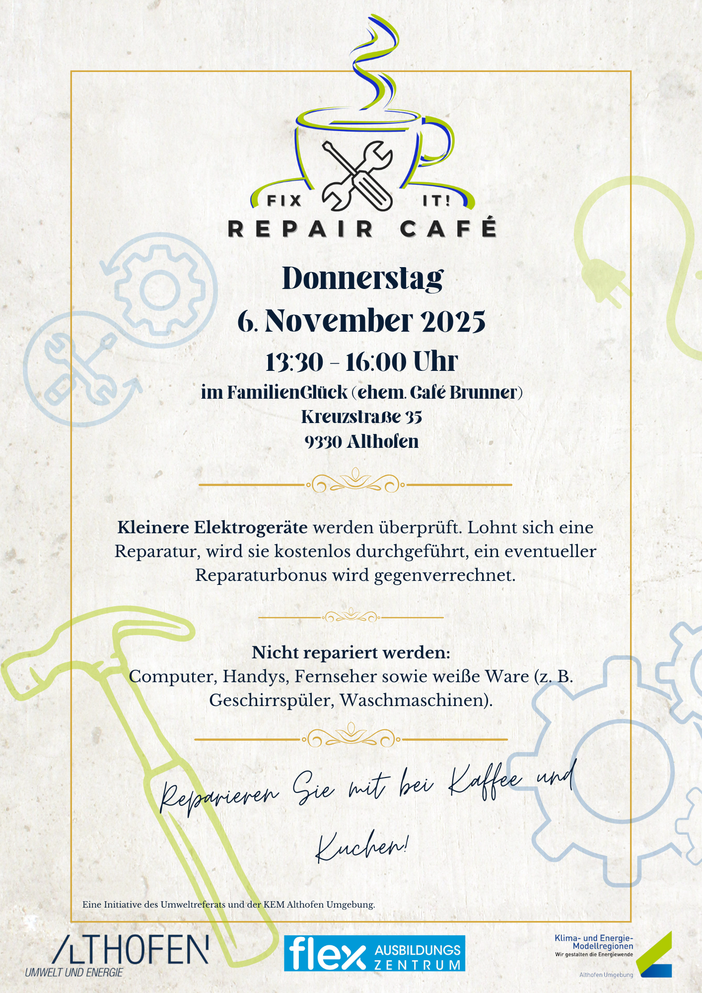 Am 6. November findet in Althofen erstmals ein Repair Café statt – von 13.30 bis 16.00 Uhr in den neuen…